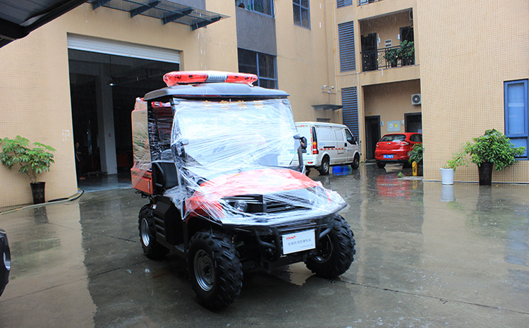 斯库尔的四轮消防摩托车上还配备齐全的专业消防器材,13马力手抬泵、细水雾装置、直流水枪、水带、消火栓扳手、灭火器、消防斧等,还配顶棚设计和喊话器、警灯警报器和U盘储存口,车身的水泵接口与消防栓接口匹配,可在林区消防管道取水灭火。